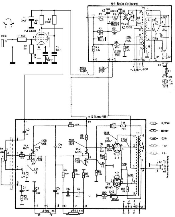 Однако, в финале все оказалось не так уж гладко. Во-первых, ВЧ-пентод 6Ж5П обладает значительным микрофонным эффектом. А, во-вторых, даже при аккуратной сборке согласно схемы, предварительный каскад заметно фонит. В итоге, поэкспериментировав, я решил использовать оригинальную схему усилителя с незначительными доработками, заключавшиеся в следующем: регулятор громкости (1 мОм вместо оригинального 470 кОм) я поставил непосредственно перед усилителем мощности, между сеткой первого триода (вывод 7) и общим проводом включил резистор 1мОм, исключив также из входной схемы конденсатор С2 и тонкомпенсирующую цепочку C1R2; катодный резистор второго триода (R9) зашунтировал конденсатором 0,1 мкФ. Сразу после выпрямителя анодного питания поставил включатель «Stand by» и оставил конденсатор 20 мкФ х 300В, подключенный к резистору блока питания R1 3,9 кОм, а в цепь питания накала ламп включил цепочку из двух резисторов 100 Ом, среднюю её точку присоединив к массе. Также я сделал линейный выход: для этого сразу после конденсатора С8 через резистор 1 МОм я поставил разъем типа «jack». В усилителе мощности между выводами 1 и 5 первичной обмотки выходного трансформатора включил корректирующую цепочку из резистора 2 кОм/2Вт и конденсатора 2200 пФ для подавления нежелательной обратной связи: