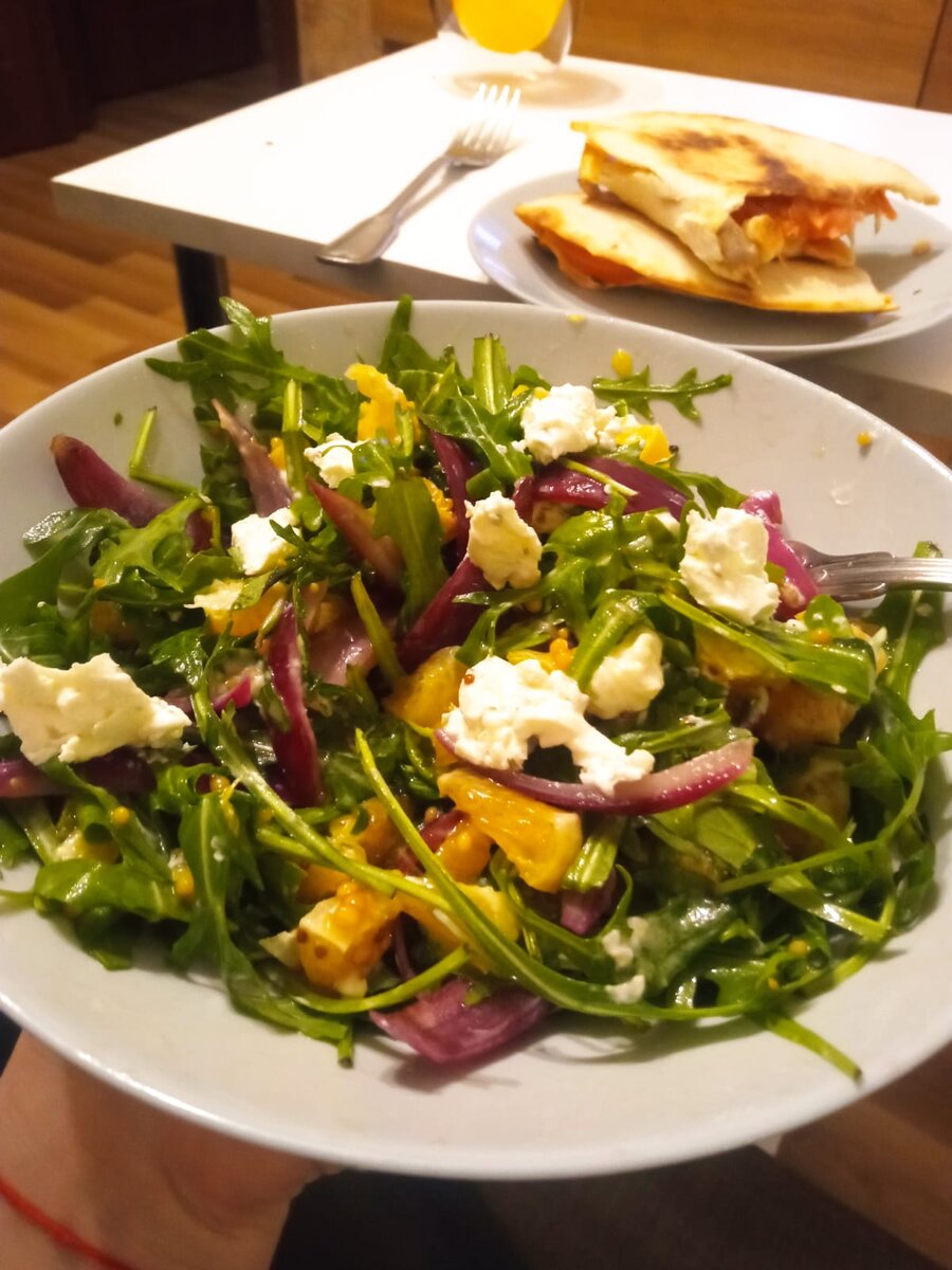 Ингредиенты: Руккола Апельсин - 1 шт Красный лук -1 шт Творожный сыр - (50-60 г) Для заправки: Дижонская горчица - 2 ч.л Оливковое масло - 4 ст.л Мед - 1/2 ч.л Соль Перец Прованские травы Бальзамический уксус - 1 ст.л 1. Смешиваем в ёмкости бальзамический уксус (1ст.л), оливковое масло(2ст.л), прованские травы, соль и черный перец 2.Целую луковицу надрезаем на 4 части ( не разрезая до основания ) 3. Тщательно обмазываем лук заправкой и упаковываем в фольгу. Выливаем сверху остатки заправки 4. Отправляем лук в фольге в духовку на 180 градусов - 20 минут, достаем, открываем фольгу и ставим в духовку ещё на 10- 15 минут 5. Рукколу тщательно промываем и высушиваем 6. Апельсин чистим и нарезаем мелким кубиком (без пленочек) 7. Полностью остывший лук разбираем на перья 7 . Выкладываем в тарелку в следующей последовательности : руккола, апельсин, запеченый лук, творожный сыр. Для заправки : Смешиваем дижонскую горчицу, мед, оливковое масло, сок апельсина, соль и прованские трав