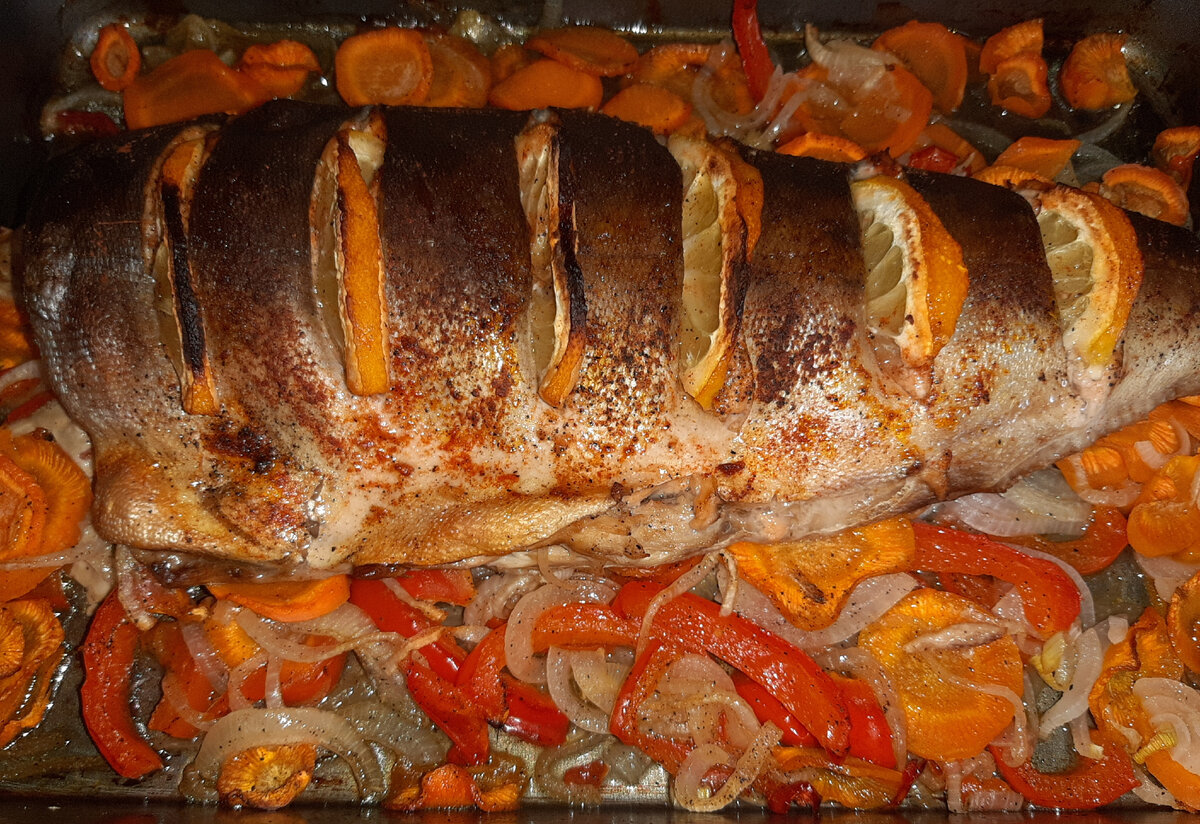 Берём 1 горбушу примерно 1-1,2 кг 1 лимон Болгарский перец 1 шт. Морковь 1 шт. Лук 1 шт. Горбушу моем, очищаем, потрошим. Натираем солью, перцем, паприкой. Выдавливаеи сок одной половинки лимона и оставляем на 30 минут мариноваться. Делаем в рыбке разрезы для долек лимона. Овощи обжариваем слегка на сковороде, минут 5-7. Далее в форму кладём овощи, сверху рыбу. И запекаем в духовке 30 минут при 180 гр. К такой рыбке прекрасно подойдёт гарнир из риса или картофельного пюре.😊👍🏻