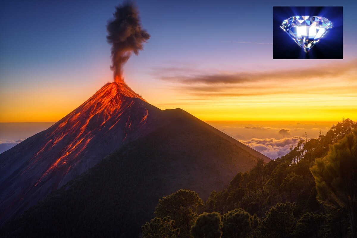 Углерод в земной мантии под воздействием давления становится алмазом. Именно вулканы поднимают так называемую кимберлитовую породу, выше к поверхности. Углерод проникает глубоко под литосферные плиты через всевозможные щели в земной коре и сильно понижает температуру плавления мантии. Таким образом, образовываются карбонизированные породы или расплавы, они и подпитывают вулканы. Алмазы поднимаются к поверхности с восходящими мантийными потоками. Более того, при мощном извержении вулкана, поднявшееся давление способно выплеснуть алмазы в атмосферу. Именно так произошло с последним извержением подводного вулкана Хунга-Тонга-Хунга-Хаапай, посреди Тихого океана, сопровождающееся настоящим дождем из драгоценных камней. Извержение этого вулкана случилось ровно 1 год назад. Большинство алмазов образовалось еще в самом начале существования нашей планеты, поэтому чаще всего их большая часть сосредоточена в уже потухших вулканах, которых только в России насчитывается около 200. А вот кимберлитов