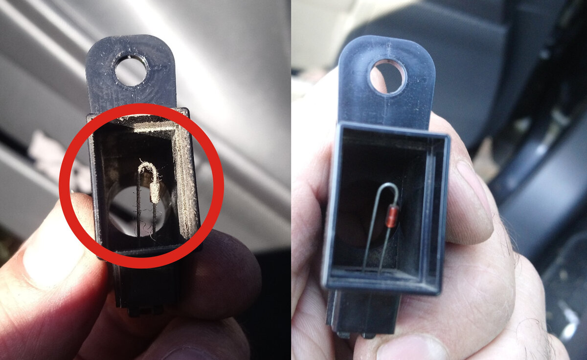 Почистил датчик температуры. Результат — более логичная работа климата в режиме АUTO Датчик был грязный. Фото ДО и ПОСЛЕ Для доступа к датчику необходимо снять слева нижнюю секцию приборной панели. Для этого снимаем боковую отделку приборной панели и тянем нижнюю часть панели на себя. Для удобства откручиваем разъем OBD-2 и рычаг открытия капота. Стрелкой обозначено расположение датчика температуры. Отщелкиваем нижнюю секцию приборной панели, тянем на себя. Откручиваем датчик температуры от панели. Отсоединяем электропроводку от кнопок. Вытаскиваем датчик температуры из воздуховода Чистим датчик температуры. Я его продул и аккуратно протер мягкой тканью Моем нижнюю секцию панели. Стрелкой обозначено место крепления датчика температуры на нижней секции. Собираем все в обратном порядке