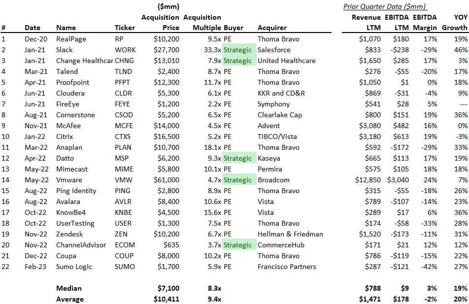Средняя цена приобретения этих компаний составила 7,1$B. Есть очень много интересантов для M&A и потенциальных покупателей, которые могут потратить миллиарды наличными. Однако, как только оценка компании превышает 5B$, круг корпоративных покупателей (Salesforce, Microsoft, Adobe, Google) и частных инвестиционных компаний (Thoma Bravo, KKR, Vista, Clearlake) значительно сокращается.