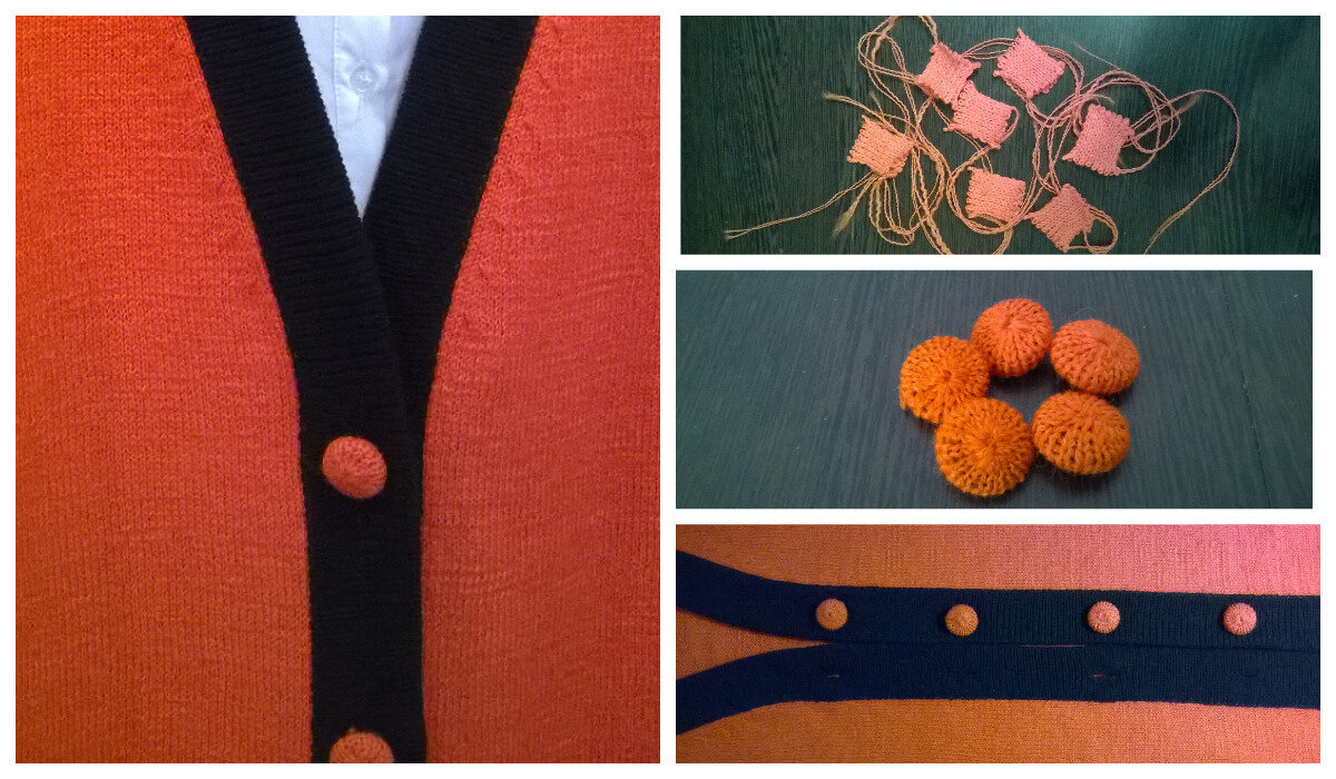 Обтягивать трикотажным полотном можно как специальные пуговицы-заготовки, так и любые ненужные вам, я предпочитаю брать пуговицы на ножке: Выдвинуть в РП необходимое количество игл (в моем примере 8 игл на верхней фонтуре и 7 на нижней): Сделать ряд-зигзаг бросовой нитью, повесить "семерку" с грузиком связать несколько рядов ластиком. Нажать на каждой фонтуре по одной кнопке PART так как показано на фото и поставить рабочую плотность (у меня 6): Сделать 2 ряда круговым вязанием катушечной или кордовой нитью (чтобы можно было легко отделить брос от полотна): а затем вязать круговым вязанием попеременно несколько рядов основной нитью, 2 ряда катушечной, несколько рядов бросовой и т.д. столько раз, сколько вам нужно заготовок для обтяжки пуговиц: Закончить бросовой нитью, снять с игольницы, поутюжить, дать остыть, убрать бросовую нить: Собрать на иглу открытые петли с одной стороны заготовки, закрепить нить на изнанке, вставить внутрь пуговицу: Собрать открытые петли на второй стороне, ст