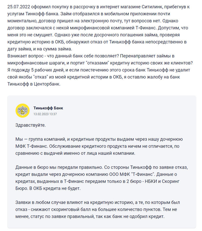 Краткая история, которая есть и на скрине. Муж оформил небольшой кредит в магазине Ситилинк на короткий срок, закрыл кредит досрочно. При оформлении кредита онлайн выбирался банк Тинькофф, обслуживался кредит в приложении Тинькофф. Проверил муж кредитную историю, где выяснилось, что Тинькофф ему вообще-то в этом кредите отказал... Фееричный ответ от Тинькофф очень удивил. Надеюсь вы осознаете всю абсурдность ситуации? Банк тинкофф предложил воспользоваться кредитованием, но когда клиент принял предложение, банк тинкофф перенаправил займ в карманное мфк, а в кредитной истории клиента прописал отказ. Обслуживание кредита осуществлялось через приложение банка тинькофф, при том что банк к займу не имеет никакого отношения. 10 раз подумайте, стоит ли брать вообще какие-то кредиты в этой шараге. Пост автора MargaritaVV. Узнать, что думают пикабушники.
