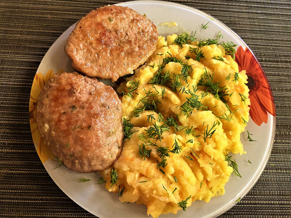 Картофельно-тыквенное пюре получается рыжеватого оттенка и тыкву во вкусе не найдёшь.