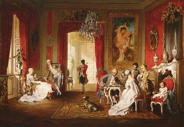 На огромном количестве картин, посвящённым шахматам, женщина обыгрывает мужчину. Это связано не только с тем, что известно много страстных и сильных шахматисток прошлого, таких как Луиза Савойская или Наталья Пушкина (да-да, жена Александра Сергеевича).