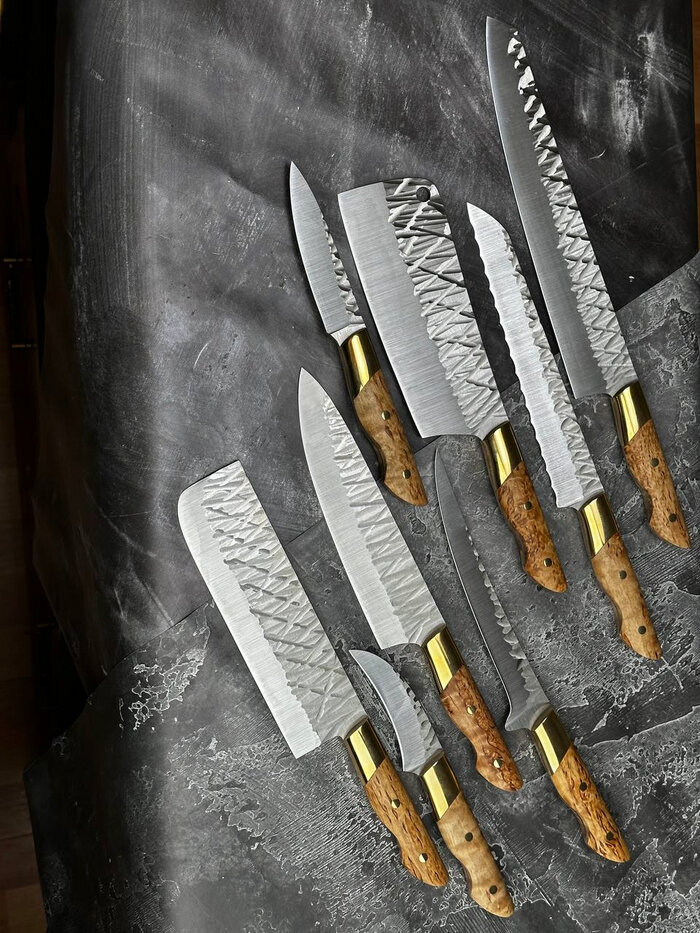 Добрый Всем, кто меня читает! Сделал на заказ такой набор: Состав набора: шеф нож, тесак, накири (для шинковки), фруктовик (малый универсал), хлебный, обвалочный (разделки мяса с кости и сухожилий, также как филейный), для чистки корнеплодов или нож для грейпфрута (с кривым клинком) и самый длинный для нарезки больших продуктов (головка сыра, семга и прочее). Смысл набора: полностью закрыть все потребности в ножах на кухне, разве что не хватает пары тройки узкоспециализированных ножей. Сталь АУС10, 61HRC. Рукоять стабилизированная карельская береза и латунь. На клинке битый камень: для красоты и чтобы продукты не налипали про резке. Сейчас буду делать ему подставку. Спасибо за внимание и Всем хорошего настроения и острых ощущений! Больше комментариев на Пикабу.