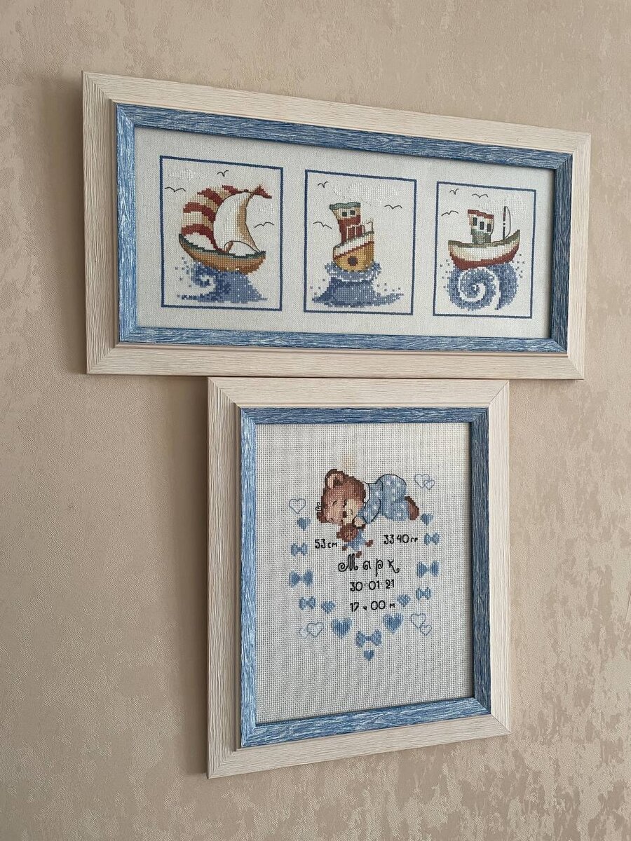 Всем привет! На прошлой неделе я делилась тем, что оформила метрику для крестника. Теперь пришло время показать, как все вышитые малышу размещено на стене в его комнате. Об обеих работах рассказывала в своем блоге раньше, поэтому просто оставлю тут ссылки на статьи: Теперь картины висят напротив кроватки малыша и, надеюсь, радуют его.