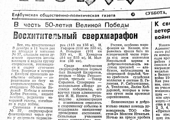3 декабря 1994 года в Елабуге на площади возле 37-го магазина, под звуки духового оркестра, разминалась группа спортсменов. Они готовились к суточному сверхмарафону. Человеку, не знакомому с этими экстремальными увлечениями, такое покажется, конечно, немыслимым. Обычному человеку не спать 24 часа — уже тяжелая пытка, а тут нужно не просто бодрствовать, а непрерывно бежать. Но оказывается, такое возможно, и это было продемонстрировано прямо на улицах Елабуги.