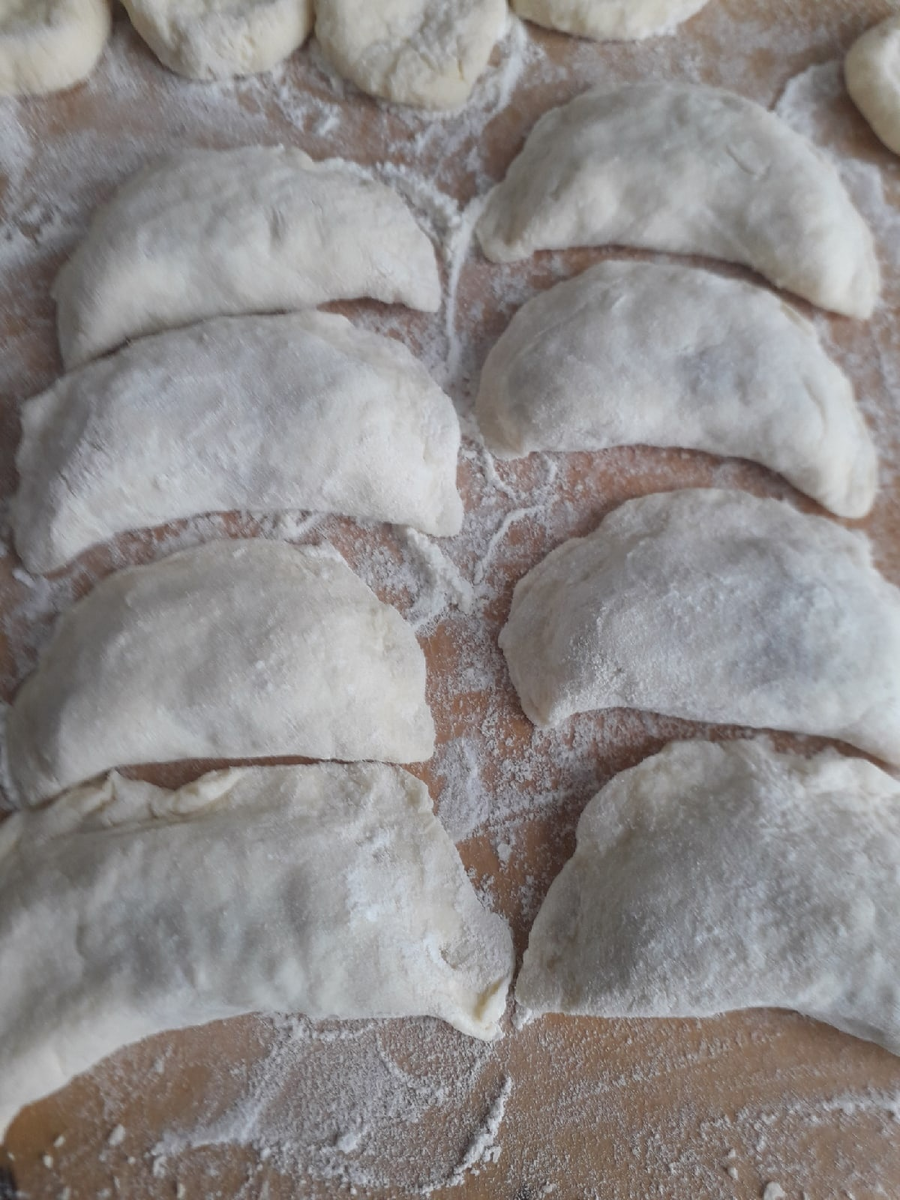 К начинке претензий побольше. Самые вкусные посикунчики с мясом, именно мясо дает свой сок. Фарш лучше самодельный: свинина, говядина, лук. По консистенции чуть пожиже, нужно добавить побольше водички. Чтобы фарш при выкладывании на сочень давал водичку для смачивания краев, чтобы пирожок лучше защипывался. Жарим в растительном масле .