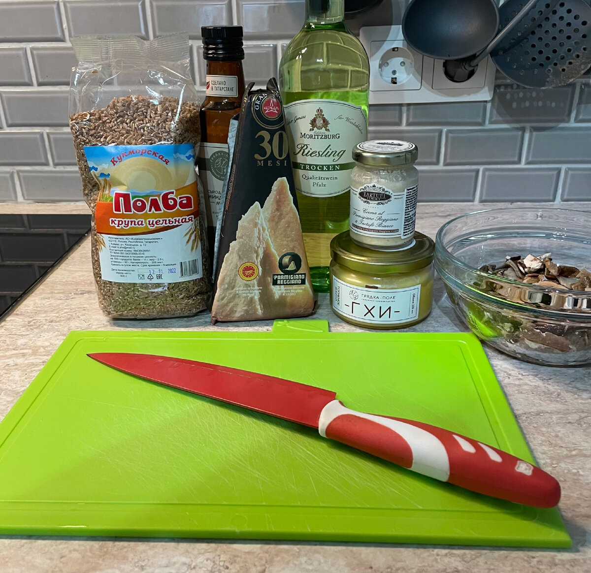 Сегодня расскажу как приготовить ложное ризотто из полбы с белыми грибами. Итак, нам понадобится: В своем рецепте я использовала сушеные белые грибы, которые предварительно замачивала в воде 3 часа. Во-первых, нам необходимо сварить грибы. Перекладываем их в кастрюлю и заливаем водой так, чтобы вода покрывала грибы на 3-4 см, ставим на сильный огонь и доводим до кипения. После кипения убавляем огонь до среднего, при необходимости снимаем пену и варим грибы еще 30 минут. Мы получим хороший насыщенный бульон, который пригодится нам позднее. Процеживаем бульон и откладываем грибы в сторону. Теперь необходимо мелко нарезать лук и чеснок. На хорошо разогретую сковородку добавляем растительное масло и чайную ложку масла гхи, затем отправляем мелко нарезаный лук и обжариваем до прозрачности, затем добавляем чеснок. Жарим еще минуту, чтобы чеснок успел отдать свой вкус. Далее отправляем грибы к луку и чесноку и обжариваем пару минут. После грибов необходимо добавить промытую крупу и обжарить в