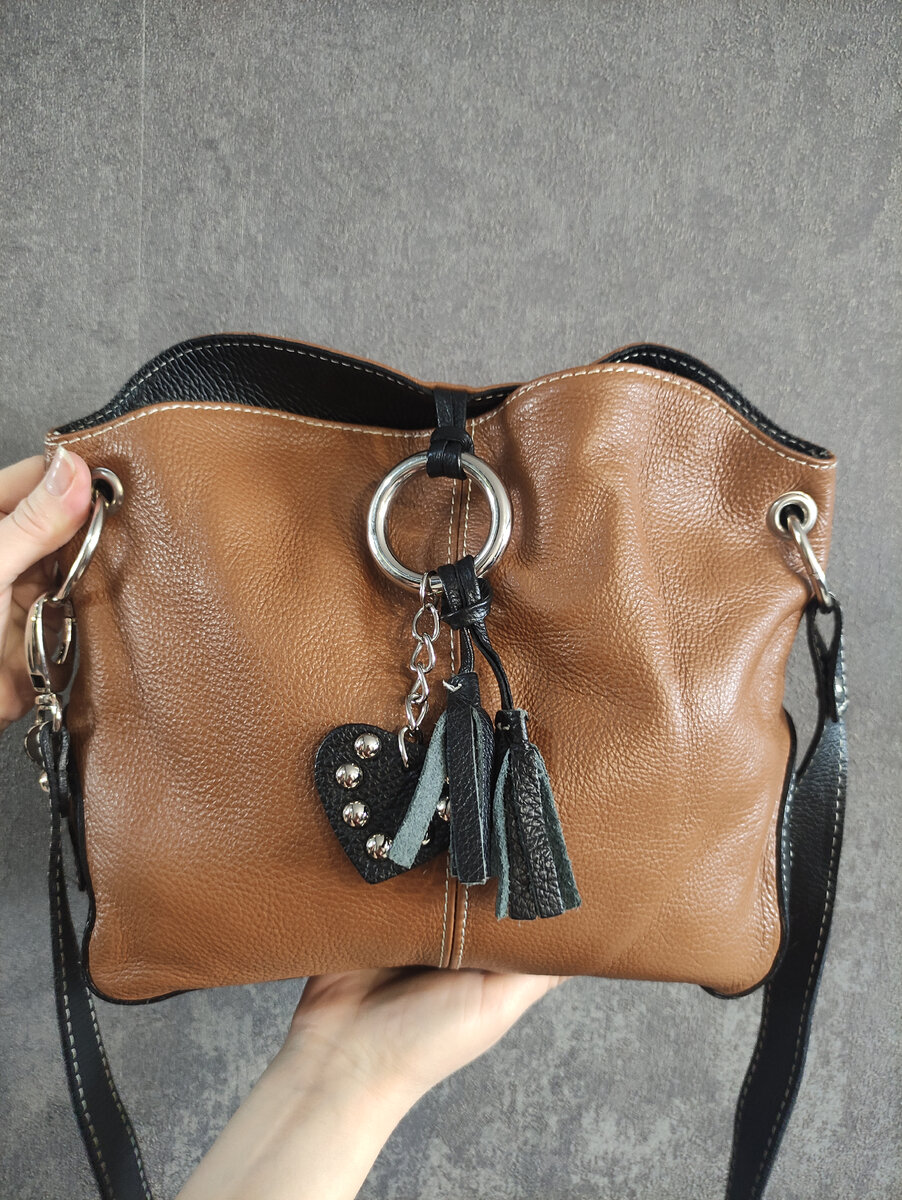 Сумка из натуральной кожи цвета карамели в комбинации с черными деталями – ремешком, внутренней отделкой и милыми брелоками.