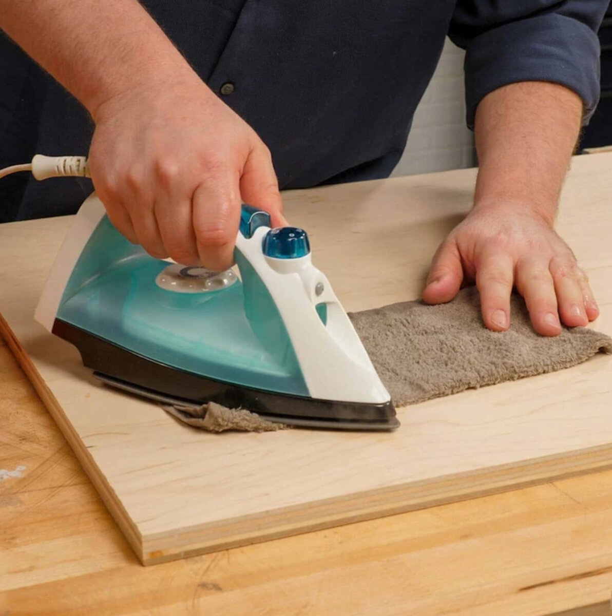 Понадобятся утюг и слегка влажная, но не мокрая тряпка. Положите ее на место ремонта и пройдитесь по ней максимально горячим утюгом. Под действием тепла вода начнет испаряться, и частицы пара попадут в поврежденные древесные волокна. Они расширятся и под действием утюга вернут первоначальную форму.