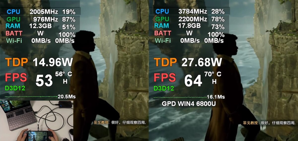 Компания GPD запустила прямые продажи портативных Windows-консолей GPD WIN 4, а также сообщила цены на разные версии устройства и показала, как на ней работает Hogwarts Legacy. Так выяснилось, что установленный в консоль AMD Ryzen 7 6800U с графикой Radeon 680M вполне успешно справляется с новой игрой по вселенной "Гарри Поттера", показывая больше 50 кадров среднего фреймрейта при 15 Вт TDP. Значение TDP в 28 Вт позволило консоли получить почти 20% дополнительной производительности. Самая минимальная версия консоли поставляется с 512 Гб постоянной и 16 Гб оперативной памяти по цене в 4999 юаней (около 53 000 рублей), а версия с накопителем на 1 Тб стоит на 4 000 рублей дороже. Самая же максимальная комплектация с 32 Гб оперативной и 2 Тб постоянной памяти, которая поставляется с 4G-модулем, обойдется в 80 000 рублей.