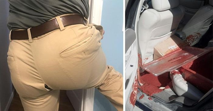 Провалы, к сожалению, не приветствуются. По этой причине нередко случаются всевозможные неприятные казусы. Компьютер ломается в неподходящий момент, вы роняете кофе, на дорогах пробки и так далее. Но порой казусы бывают настолько неприятными и обидными, что можно потеряться в выражениях. Вот так рабочий день у паренька! Ладно хоть он сам не пострадал. И ведь самое обидное, что никто ему ничего не сказал про дырку на штанах. Последствия от молока под давлением. А это совсем обидная ситуация! От летящего самолета упала запчасть и пробила стекло. И ведь это еще не самое плохое последствие, ведь деталь могла упасть и на человека. Гений начальник велел все зерна засыпать в одну емкость, а теперь просит их отделить. Так и хочется спросить: ”Ну почему именно сейчас?”. Бедный уборщик… Надеемся, что хоть какая-то надбавка за этот ужас будет. Не пропустите: 1. В России готовится замена денег: совет для всех россиян (читайте здесь) 2. Находка под Крымским мостом заставила всех молчать от ужаса