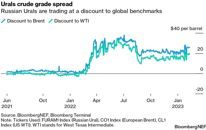 Однако нефтяные доходы России пострадали как от санкций, так и от изменений в торговых потоках, и стране пришлось предлагать значительные скидки на свои сорта нефти, чтобы привлечь покупателей. Российская нефть марки Urals, основной сорт в стране, торговалась на уровне 21 доллара за баррель ниже общемирового ориентира Brent в декабре прошлого года. По данным Bloomberg News, доходы страны от экспортных пошлин на нефть упали до 50 миллионов долларов за неделю, закончившуюся 27 января. Это на 44% ниже, чем средний недельный уровень в размере более 90 миллионов долларов в течение 2022 года.