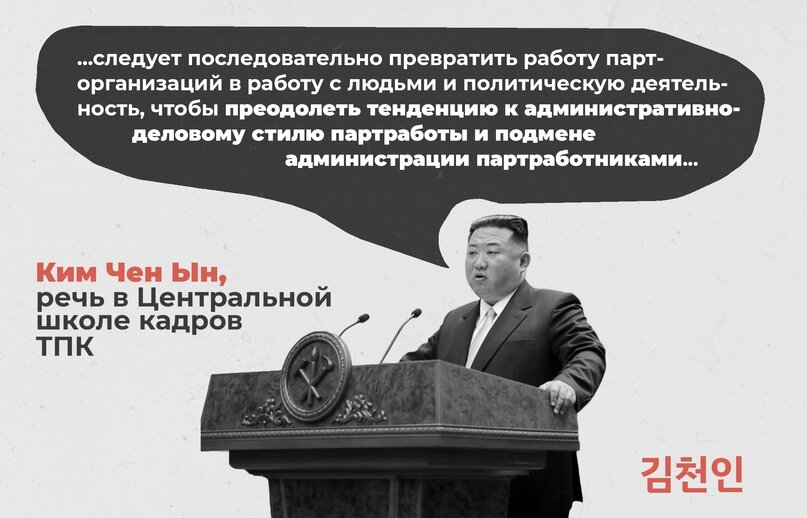 Здесь Ким Чен Ын уже прямо ставит задачу по разбитию капиталистической системы управления. И речь не про коллективное руководство парткома (об этом еще Ким Ир Сен и Ким Чен Ир говорили), а про преодоление «тенденции к административно-деловому стилю партработы и подмене администрации партработниками». Из всей речи это наиболее ключевые, решающие слова. Эта же задача ставилась и Лениным в свое время: «...Ведь только что все говорили и все согласились, и получилось полное единогласие (а это очень важно: от этого единства и действие зависит), что аппараты партийный и советский следует размежевать.