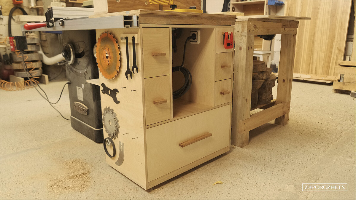 На боковой стене расположилась оснастка для фрезера и циркулярки.