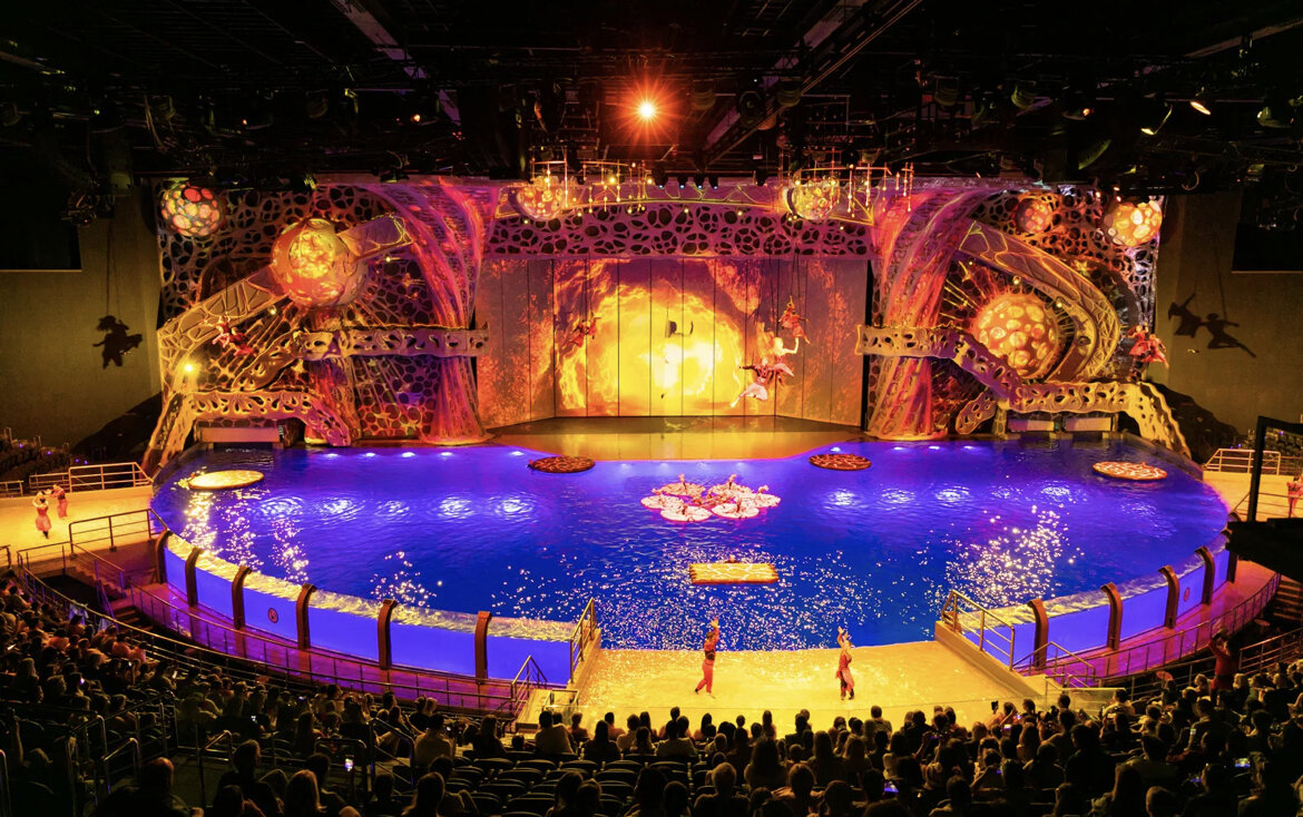 Шоу называлось очень жизнеутверждающе : «Морская симфония Вивальди. Времена года» и было просто невероятно эффектным по своему наполнению : живой оркестр, оперная певица, летающие музыканты, белый рояль, акробаты и спецэффекты.