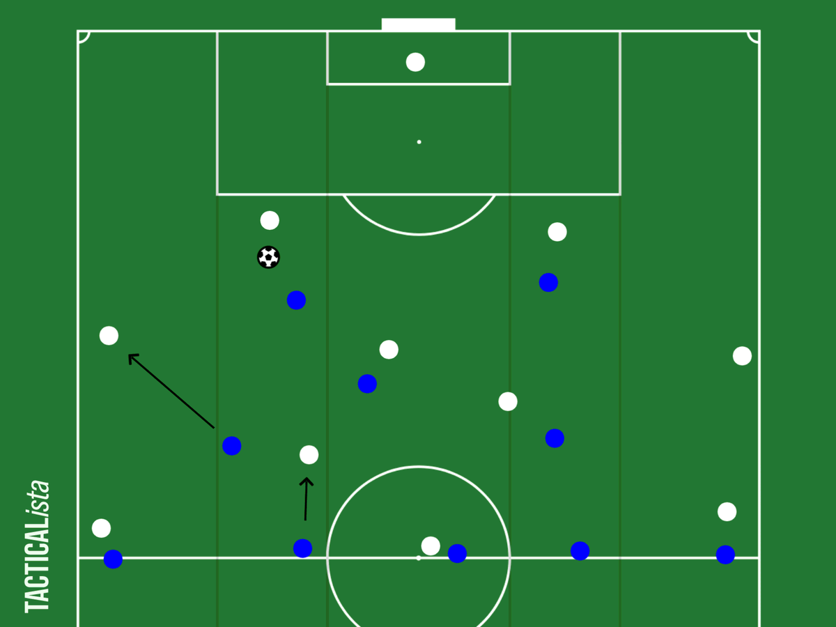 Латерали у Гасперини больше не действуют по фулбекам соперника в финальной трети — теперь их накрывают находящиеся довольно широко центральные полузащитники. Сами латерали остаются с вингерами. Соответственно, поменялась роль и крайних центральных защитников. Вероятно, раньше против команды с тройкой нападающих они бы были прямыми оппонентами вингеров, но теперь должны выдвигаться на восьмерок.