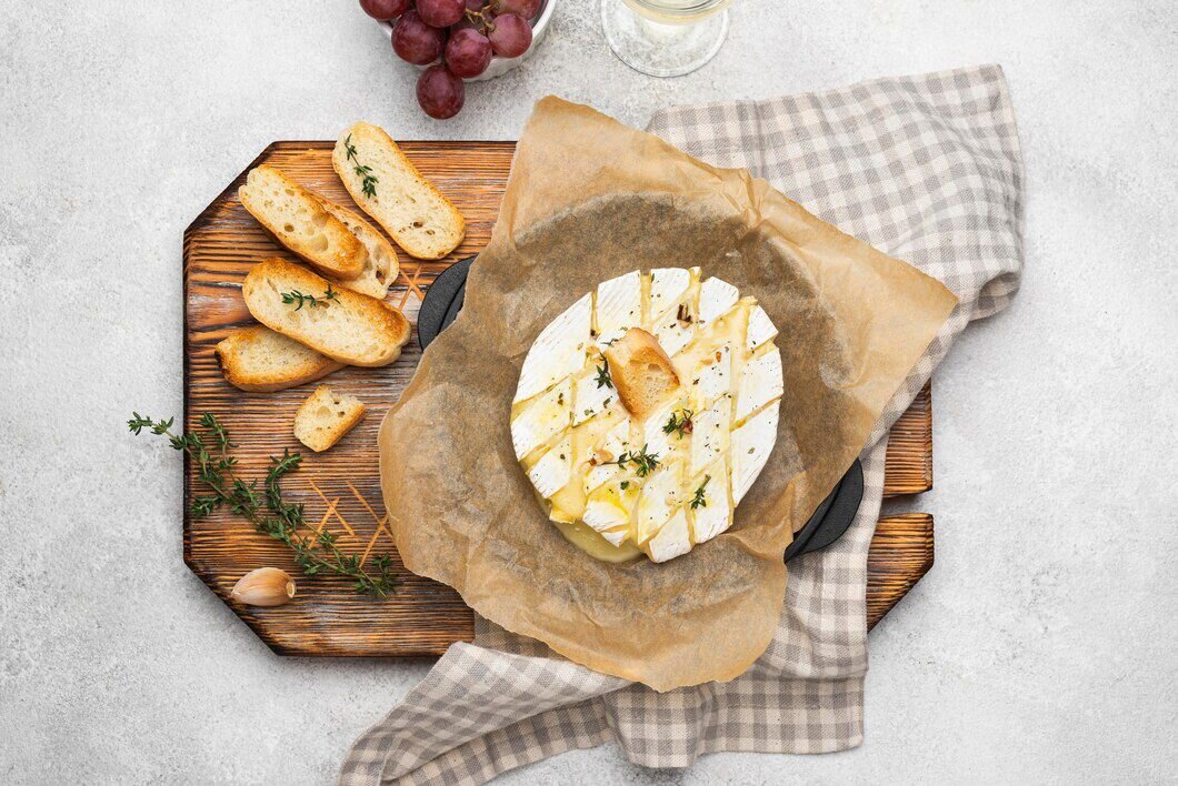 4. Пока камамбер запекается, приготовьте багет. Нарежьте его на куски и подсушите в духовке. Если остается чеснок от сыра, можно натереть им. Если нет, просто слегка смажьте оливковым маслом и поджарьте в духовке.