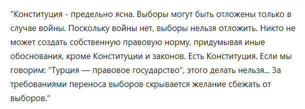 - Оппозиция считает, что выборы отложить нельзя: "Ни Высшая избирательная комиссия (турецкий ЦИК), ни президент страны не имеют права отложить выборы. Когда есть Конституция, воля ЦИК или любой другой структуры не имеет силы". - но мы то уже знаем, что власть думает о конституции ↑↑↑
