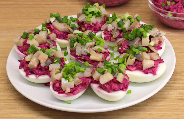 Яйцо фаршированное Яйцо - 3 шт. Картофель - 1 шт. Морковь - 1 шт. Свекла маленькая - 1 шт. Сельдь - 150 гр. Майонез - 2 ст. ложки Огурец не большой - 1 шт. Зелень по вкусу Варим картофель, яйца, свеклу, морковь. Остужаем и нарезаем мелкими кубиками, соломкой - кто как умеет самое главное мелко. Мельчим так-же огурец и рыбу. Разрезаем яйца пополам, желтки мельчим и добавляем к основной массе начинки, туда же огурцы с рыбой, заправляем майонезом, можно не много подперчить и подсолить - по вкусу. Забиваем половинки белков массой. Выкладываем на тарелку украшаем зеленью. Приятного аппетита!