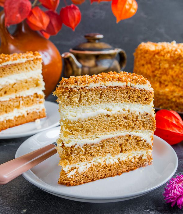 Коржи в торте медовые, а вот крем — не из сметаны с сахаром, а из крем-чиза с лимоном и сгущенкой. За счет сыра он получается таким густым, что крем можно уложить между коржами толстым слоем. А за счет лимонного сока в составе у торта есть характерная кислинка, хоть и не сметанная. И как минимум для разнообразия я бы очень рекомендовал его попробовать.