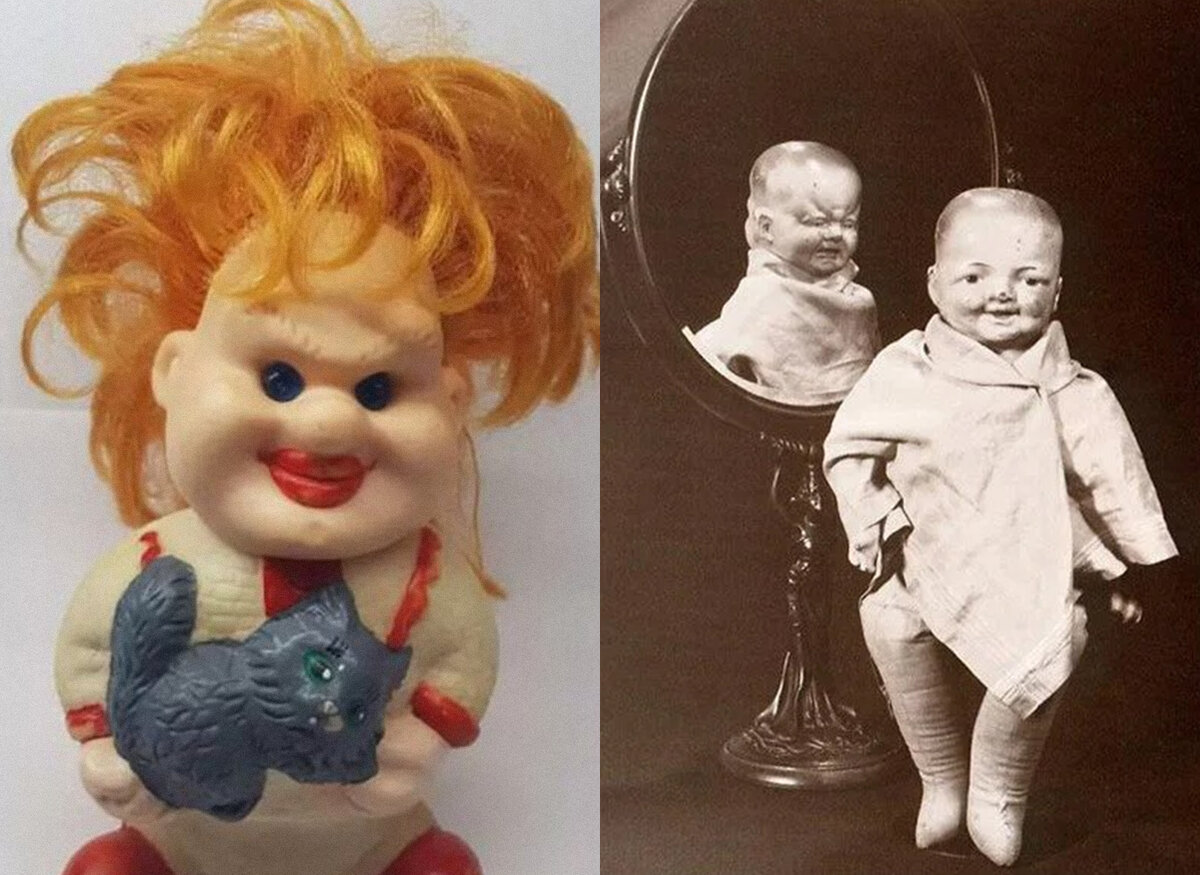 Создатели куклы в двадцатых годах прошлого века искренне считали, что показать разные эмоции малыша с разных сторон головы — прикольная идея. Спереди кукла улыбается, а на затылке плачет. Что ж, теперь вы знаете, откуда Джоанн Роулинг черпала вдохновение. Профессор Квиррелл, ты ли это?