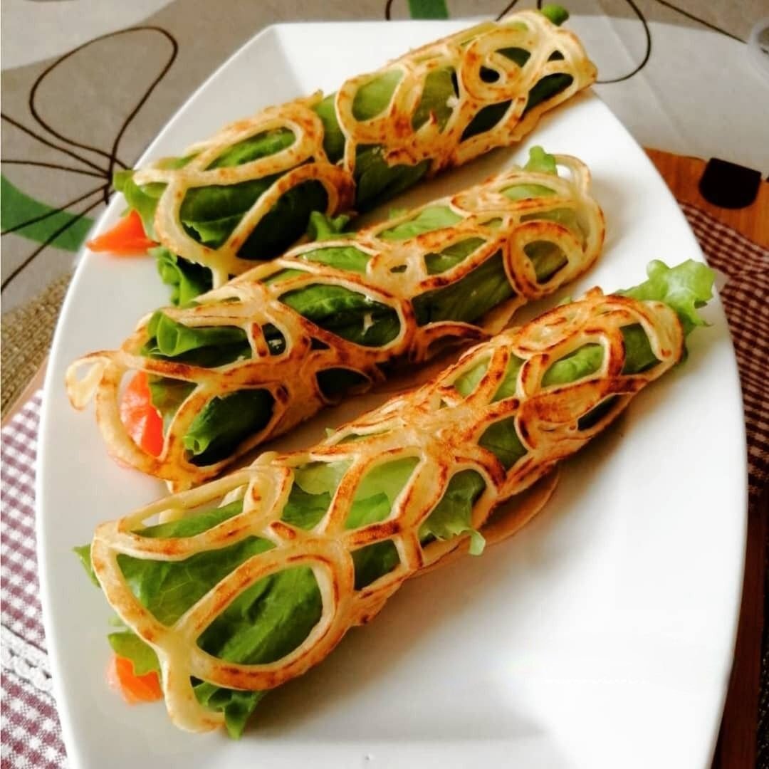 Делюсь с вами рецептом простой, вкусной, красивой и оригинальной закуски. Готовится очень быстро и легкой украсит собой праздничный стол. И в тот момент когда ваши гости или родные будут хвалить вас за интересное блюдо, можно сделать вид, что вы старались над ним часа два как минимум! Кружева плели так сказать. Процесс приготовления: Для начала замешиваем густое тесто. Для этого нам понадобится: Яйцо венчиком взбиваем с сахаром и солью. Добавляем не холодное молоко, всыпаем муку (муку предварительно просеиваем). Замешиваем тесто, следим, чтобы не было комочков. В конце добавляем растительное масло. Переливаем получившееся тесто в специальную емкость. Можно в принципе воспользоваться одноразовым кондитерским мешком, но, на мой взгляд, это менее удобно. Такую емкость можно купить во многих магазинах, стоит она очень недорого. Выливаем на сковороду (лучше на блинную) в виде кружева. Обжариваем с двух сторон. На каждый блинчик кладем лист салата, выкладываем творожный сыр, сверху несколько