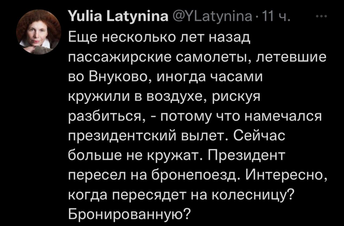 Что там с нашей Юлей опять? Что там у нее часами кружило во Внуково? И почему именно Внуково попало ей под раздачу? А над Шереметьево не кружили, что ли? Я не понимаю, какая либералам разница, на что именно пересел Путин - они вообще говорили, недавно, что он из бункера не вылезает годами. Но даже если он катается на барже, которую тянут по Москве-реке бурлаки, кого это касается, кроме Путина и нас? Нет, иной раз и правда бывает забавно кого-нибудь потроллить, прикинувшись, выразимся мягко, не слишком умной особой. Но нельзя же нести ахинею в режиме 7/24! Можно войти в роль... Я вообще думала, что Путин улетает на вертолете с крыши Лубянки. С тревожным чемоданчиком! А он, оказывается, вытащил с запасного пути бронепоезд, сел на его и катается по миру... А Юля не пьет, кстати? Ладно бы, Татьяна Лазарева такое написала или Ксения Ларина, тут вопросов нет. Я и сама, как замахну, такое могу выдать, что меня муж в таком состоянии к компу просто не подпускает. Но за мной есть кому присматри