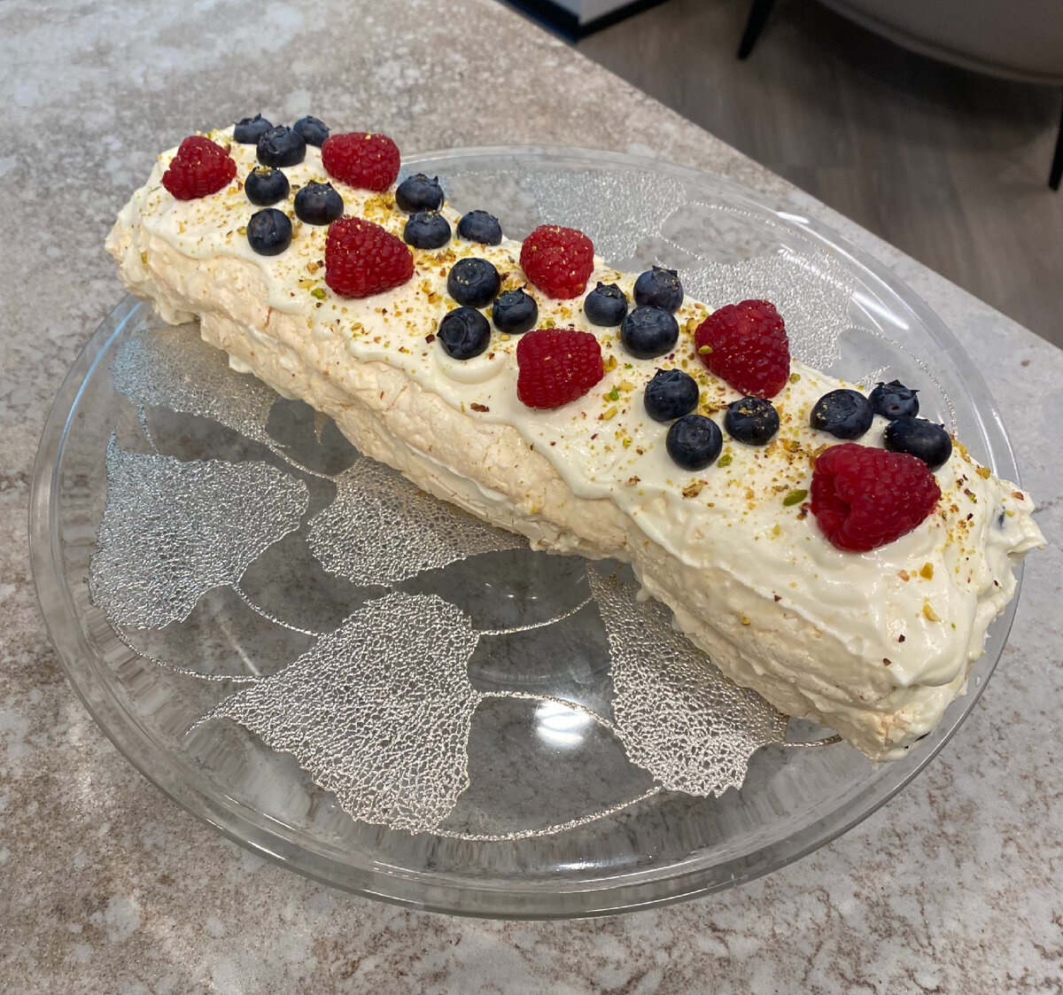 Сегодня готовим блюдо посложнее - меренговый рулет. Рецепт не самый простой, так как нужно уметь хорошо взбивать яичные белки до крепких пиков. Однако есть плюс - меренга скатывается в рулет и обильно промазывается кремом, поэтому даже если вы накосячили, выйдет вкусно ;) Для меренги: Для начинки: Для начала делаем меренгу Пока меренга готовится, сделаем начинку Когда меренга готова, достаём ее из духовки, даём чуть-чуть остыть и снимаем пергамент. На этом этапе меренга может раскрошиться и вам покажется, что все потеряно, но это не так! Даже если меренга где-то треснула и сломалась, ничего страшного, крем все исправит. На меренгу выкладываем наш крем и ягоды (оставьте немного на украшение). Посыпаем фисташкой. Получается вот так: Затем аккуратно скручиваем рулет. Все готово! Сверху я выкладываю ещё слой крема (так, во-первых, можно скрыть дефекты меренги, во-вторых, ягоды для декора крепятся лучше). Украшаем ягодами и посыпаем фисташкой. Ставим рулет в холодильник хотя бы на час