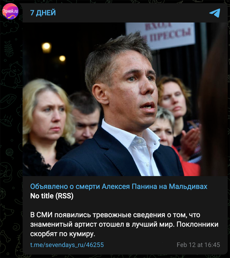 В СМИ появились новости о гибели Алексея Панина. Источники утверждают, что эпатажный артист скончался на Мальдивах. В связи с этим на одном из центральных каналов уже анонсировали передачу, посвященную тайне его смерти. Это не так. Алексей Панин опроверг слухи о своей кончине на берегах Мальдив, сообщив, что он жив и чувствует себя прекрасно. «Новый треш. Сначала были собаки, потом информация о том, что я „бомжую на помойке“, теперь это. Мне пишут и звонят люди с вопросом, жив ли я. Жив!», — отметил артист. В последнее время новости об артисте не часто появляются в русскоязычных изданиях. Алексей Панин уже долгое время проживает в Испании и готовится к выпуску нового спектакля. ОСН: Актер Панин опроверг новость о своей смерти
