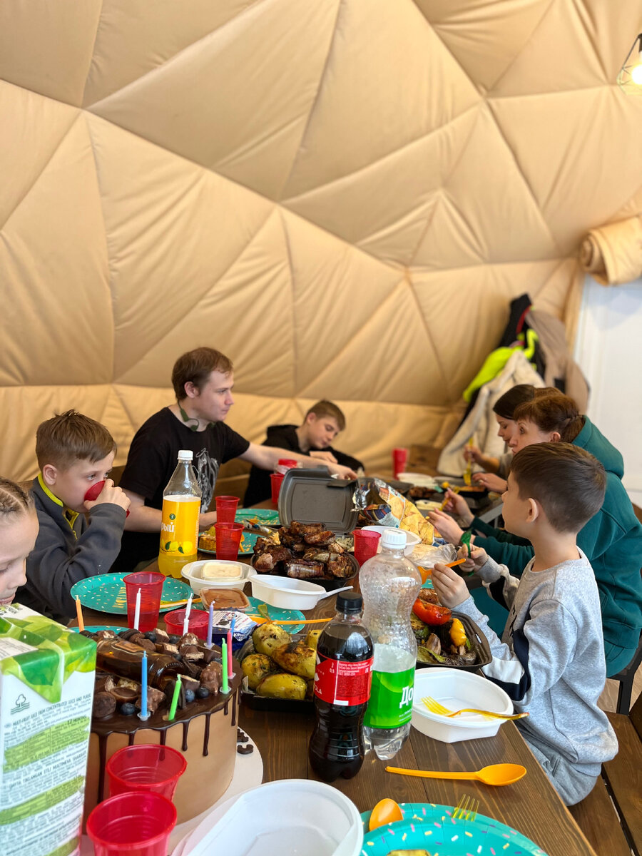 Часть вторая Начало в прошлой статье👇 Народу у нас много, помощников тоже. Поэтому быстренько накрыли стол, встретили Татьяну и Алину, ну и сели есть! Потому что половина дня прошла на соревнованиях, и все были оооочень голодны. Влада поздравили. Все по очереди ему пожелания высказали, посмеялись, поплясали, потом мне позвонили и сообщили, чтобы на катание приготовились через 20 минут. Мы детвору собрали. Торт и свечки оставили на вечер😀, не успели сразу задуть. Ну и пошли гулять, ожидая банан. Что хочу сказать😀 это очень интересная задумка. Прикиньте, додумались же люди водных игрушек использовать на снегу. Мне очень нравится банан на море. Я обожаю такие прогулки. Вот здесь почти то же самое. Накатали гладкую трассу, огромный круг по тайге. Поездка примерно 15-20 минутная. Есть горки, подъёмы и повороты. Тебя везут и среди тоннеля из деревьев, и вдоль реки. Всё это с ветерком, подпрыгивая, как на волнах. Правда, круто! Даже нам взрослым понравилось, а уж дети