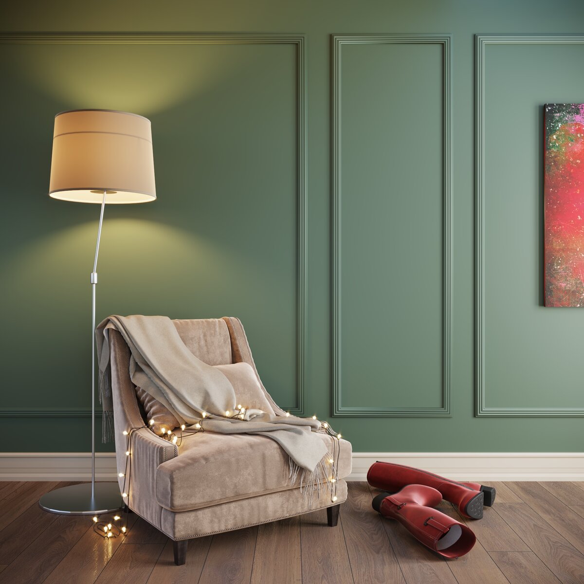 Ну и чтобы смягчить этот строгий цвет — классические молдинги на стене, белый высокий плинтус, мягкое кресло нейтрального бежевого оттенка и два теплых световых пятна: от торшера и от гирлянды. Искусственные светильники с лампами теплого света отлично контрастируют с холодным светом от окна (слева оливковая стена, благодаря освещению, теплого оттенка, справа — холодного).