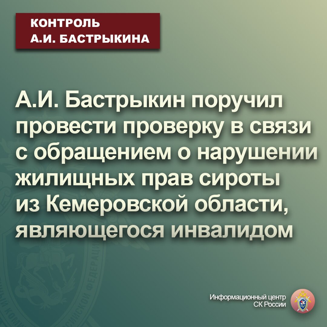 А.И. Бастрыкин поручил провести проверку в связи с обращением о нарушении жилищных прав сироты из Кемеровской области, являющегося инвалидом