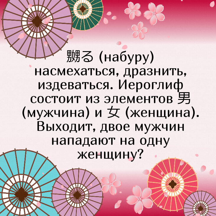 Продолжим подборку занимательных фактов (мамэ-тисики) и интересных слов, с которыми я сталкиваюсь при изучении японского. Существует и вариант с кровожадными женщинами, зажавшими мужчину - 嫐る Так называют того, с кем сложно наладить контакт, кого легко расстроить или вывести из себя малейшим замечанием, кто либо слишком самоуверен, либо страдает комплексом неполноценности. Общения с такими чрезмерно впечатлительными людьми избегают, стараются лишний раз их не тревожить, ведь связываться с ними - всё равно что трогать нарывающую болячку: как бы не стало хуже.