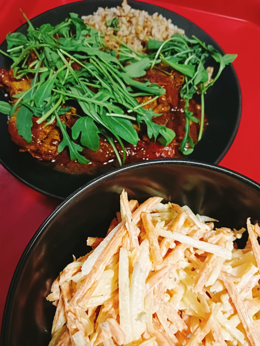 А вот и мой ужин. Курочка а-ля Путанеско и немного гречки. Хорошая порция салата обязательно )) Рецепт салата я уже выкладывала, а вот и курочка а-ля Путанеско: Филе куриных бедрышек - 1 лоток Лук красный - 1 головка Болгарский перец - 1 шт Помидорки черри - 1 уп Маслины - 1 банка Каперсы - 1 столовая ложка Томатная паста - 2 ст.ложки Растительное масло - 1 ст.ложка Соль, перец Зелень для украшения С филе бедрышек снимаем кожу, обжариваем на растительном масле. Солим, перчим. Достаем из сковороды и перекладываем в противень. Лук режем полукольцами, перчик довольно крупными квадратиками - обжариваем в той же сковороде, что и курочку. Добавляем томатную пасту, каперсы и немного обжариваем. Теперь к овощам в томатной пасте, добавляем полстакана воды, маслины и порезанные пополам помидорки черри. Тушим 10 минут. Овощной смесью, заливаем обжаренные бедрышки и убираем всё в духовку 180° на 20 минут. Украшаю рукколой. Приятного аппетита!