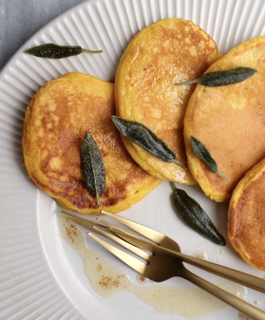 В последнее время мне очень полюбились соленые завтраки. Так, листая кулинарную книгу моего любимого автора — Mimi Thorisson — я нашел рецепт тыквенных блинчиков, пухленьких панкейков. Перед тем, как приступить, нужно запечь тыкву баттернат. Обычно я разрезаю ее пополам, вынимаю семена, и отправляю в разогретую до 180С духовку примерно на 45-60 минут, зависит от размера. Можно ускорить процесс: нарезать необходимое количество кубиком, и запечь на пергаменте (тогда возьмите в 2 р больше сырой тыквы, чем указано в рецепте). После чуть остудите тыкву, снимите кожицу, пюрируйте блендером. Поехали готовить! На 3-4 порции: Для соуса: Неповторимый вкус тыквенным панкейкам придает именно коричневое масло в шалфеем. Как и на что его заменять — дело вкуса, но для меня со сметаной это уже совсем другая история, конечно. Для большего удовольствия можете посыпать блинчики обжаренным и чуть смолотым фундуком!
