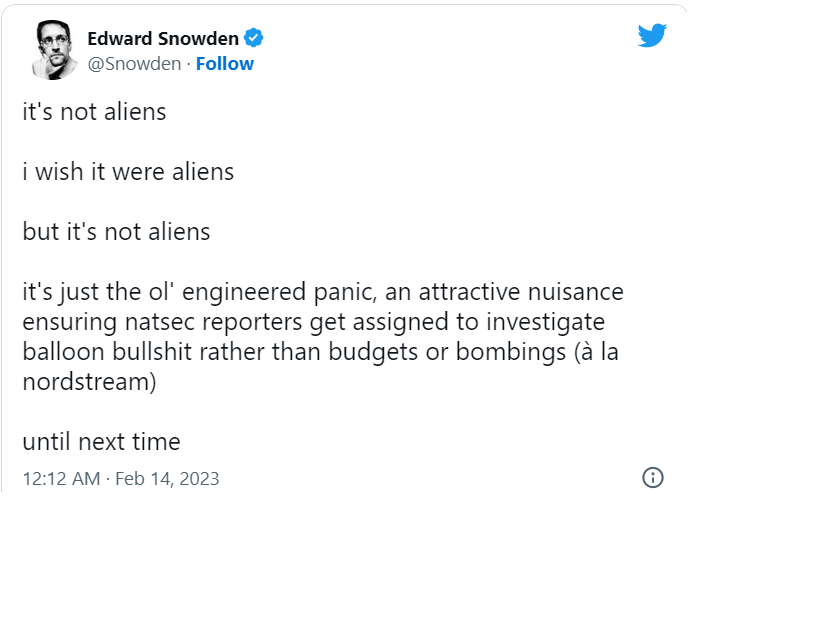 Написав в Твиттере, Сноуден сказал: "Я бы хотел, чтобы это были инопланетяне, но это не инопланетяне, это просто старая искусственно вызванная паника, привлекательная помеха, которая гарантирует, что репортерам по национальной безопасности поручат расследовать чепуху с воздушными шарами, а не бюджеты или взрывы (а-ля "Северный поток")".