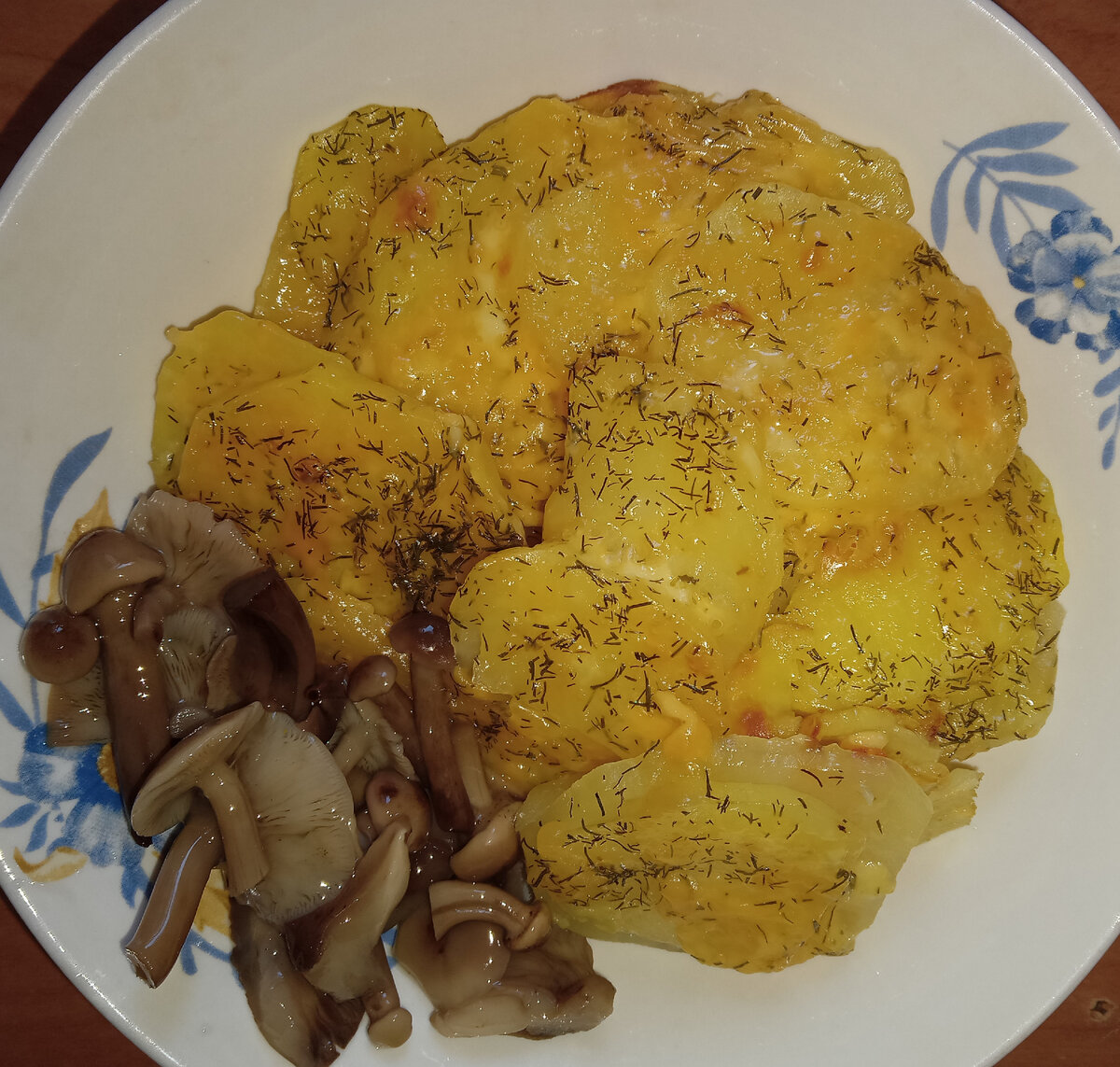 Картошка с сыром Это очень простой рецепт приготовления картошки с сыром в духовке. Картофель моем, чистим и нарезаем на тонкие колечки. Твердый сыр натираем на крупной терке не более 100 г. Слегка смазываем противень подсолнечным маслом и выкладываем туда картофель ровным слоем, который при этом не забываем солить по вкусу. Сверху посыпаем тертым сыром и сушеным укропом. Накрываем весь противень фольгой и убираем в духовку , разогретую до 250 градусов, на 20 мин. Через 20 мин снимаем фольгу и оставляем в духовке картофель еще на 15- 20 мин до ее подрумянивания. Все готово! Приятного аппетита! P.S. Тут я добавила на тарелку маринованные опята :)