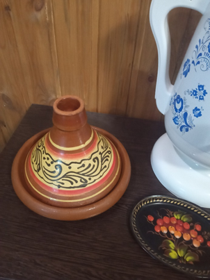 Подарили мне тажин. Тажин это сотейник с высокой конусообразной крышкой. У меня он вот такой: Что эта посудина называется «тажин», я нашла по картинке в интернете, сделав запрос «азиатская посуда для приготовления горячих блюд». У меня тажин небольшой, но на 2 едока можно в нём приготовить. Разобралась, что мой тажин сделан из обычной керамики, не из жаропрочной, значит перед использованием его нужно подержать в воде несколько часов, что я и сделала. В моём тажине нельзя готовить на индукционной плите. Я готовила в духовке. Чем интересен тажин? Блюда в нём не пригорят и не пересохнут. В процессе нагрева пар внутри тажина конденсирует внутри высокой крышки и снова возвращается в готовящееся блюда насыщенным соком. Блюда в тажине томятся 2-3 часа при невысокой температуре. Я духовку разогрела до 160 градусов. Крышку не поднимала в процессе готовки! Рецепты блюд можно найти в интернете, но я сделала просто: слоями – лук полукольцами, мясо, морковь, картофель, перец болгарский. Овощи рез