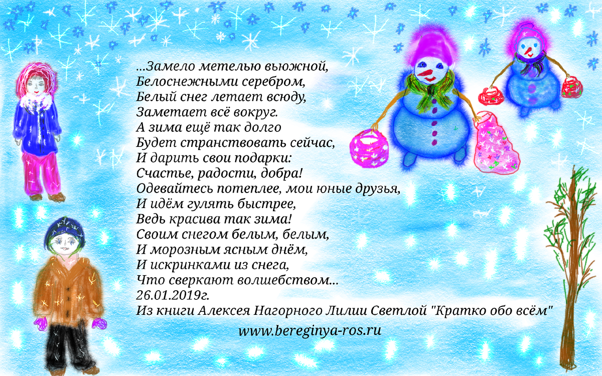 Замело метелью вьюжной, Белоснежными серебром, Белый снег летает всюду, Заметает всё вокруг. А зима ещё так долго Будет странствовать сейчас, И дарить свои подарки: Счастье, радости, добра! Одевайтесь потеплее, мои юные друзья, И идём гулять быстрее, Ведь красива так зима! Своим снегом белым, белым, И морозным ясным днём, И искринками из снега, Что сверкают волшебством. 26.01.2019г. Из книги Алексея Нагорного Лилии Светлой "Кратко обо всём"
