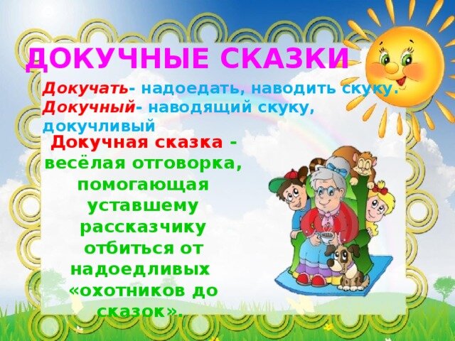 Жили-были два братца, два братца — кулик да журавль. Накосили они стожок сенца, поставили среди польца. Не сказать ли сказку опять с конца? Жил-был старик, у старика был колодец, а в колодце-то елец, тут и сказке конец. — Сказать ли тебе сказку про белого бычка? — Скажи. — Ты скажи, да я скажи, да сказать ли тебе сказку про белого бычка? — Скажи. — Ты скажи, да я скажи, да чего у вас будет, да докуль это будет! Сказать ли тебе сказку про белого бычка? — Рассказать ли тебе докучную сказочку? — Расскажи. — Ты говоришь: расскажи, я говорю: расскажи; рассказать ли тебе докучную сказочку? — Не надо. — Ты говоришь: не надо, я говорю: не надо; рассказать ли тебе докучную сказочку? — и т. д.