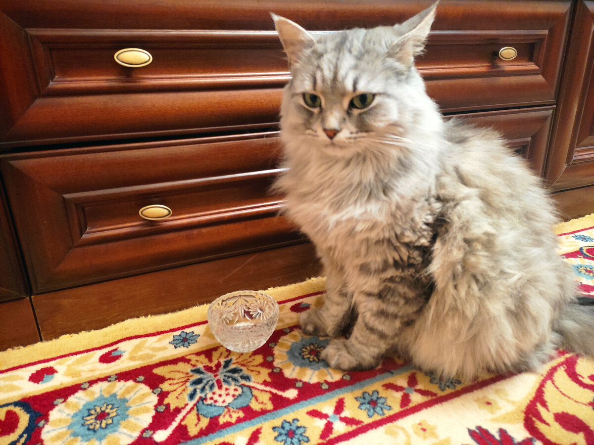 Пить из мисочки, на кухне рядом с кормом, Саша категорически отказывалась. Воду мы меняли регулярно. Изредка пила воду из-под крана, в ванной комнате. Но часто получалось, что Сашка весь день дома одна. Пить захочет, сядет в раковину, ждёт воду, а вода не течёт, кран то закрыт. Сидит, ждёт и засыпает. А когда мы домой вернёмся, воду включим, она и забыла, что хотела пить. Выпрыгнет из раковины и убежит. Доходило до того, что поили кошку насильно, из пипетки. Консультировались с врачами. Думали, что кошка не умеет пить самостоятельно.