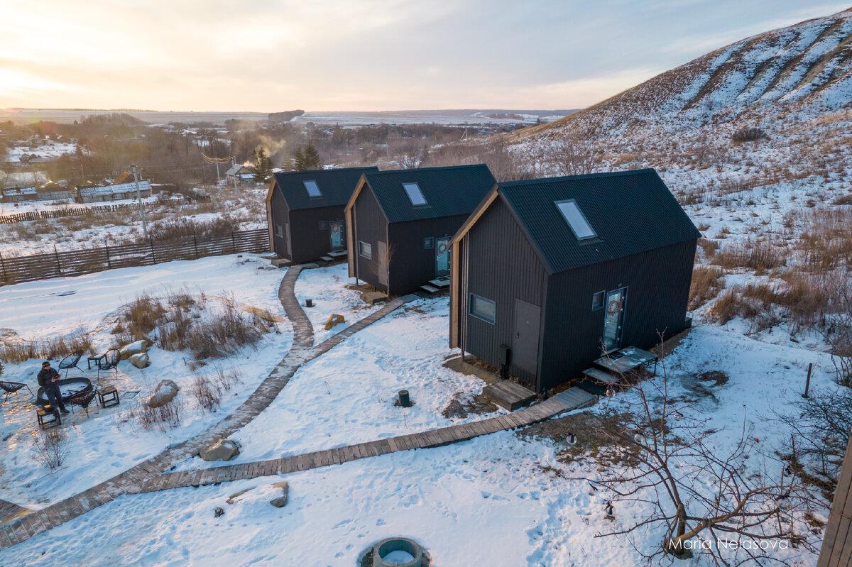Во-первых, это- красиво. И во-вторых и третьих и в двадцать пятых… Глэмпинг «Холмы». Ульяновская область. Находится в селе Тушна. Это в часе от Ульяновска, в 4 часах езды от Самары, Казани, Саранска и Чебоксар, в 3 часах езды от Тольятти и Димитровграда. В глэмпинге 3 круглогодичных гостевых домика и пять стильных палаток. Кроме этого спа-зона с купелью на улице и общая костровая зона, зона для барбекю. Начну с дизайна. Он безупречный. Сдержанный, но при этом яркий, запоминающийся черный. Если вам такое нравится, то черные здесь и унитаз, и полотенца, и столовые приборы. Как раз тот случай, когда внимание уделено каждой мелочи. От открытки на столе, до приятной ароматизации. Как говорится, заморочились ребята по полной. И это приятно. А еще хочется всё время фотографировать и фотографироваться. Но, надо расслабиться:) В домиках на первом этаже гостиная с раскладным диваном, проектор, мини-кухня и душ. Лесенка ведет на второй этаж. Там на мансарде уютная и комфортная спальня. Оба прос