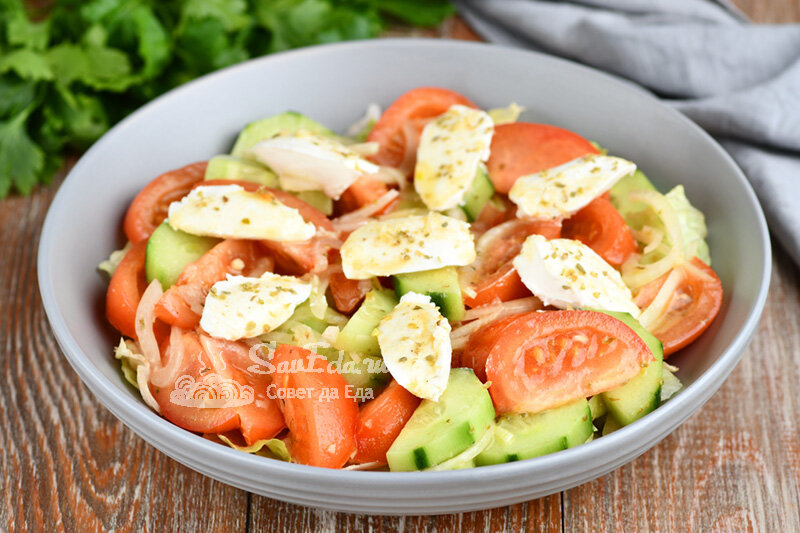 Заправку для салата замешиваю очень быстро и состоит она из простых продуктов. Этому салату дают отличный вкус заправка и творожный сыр. Сыр солененький с приятным сливочным вкусом, он прекрасно сочетается со свежими овощами и добавляет изюминку. Овощи можно брать любые по вкусу. Покажу самый простой вариант салата. Он хрустящий и очень-очень вкусный. Порции 4 Время подготовки 5 минут Время приготовления 15 минут Ингредиенты Для салата: Для заправки: Инструкции 1. В глубокую миску добавляем соль, сахар, пропущенный через пресс чеснок, горчицу, масло, сок лимона и орегано (1 щепотка). 2. Хорошо перемешиваем венчиком и заправка готова. У нее яркий отличный вкус. Орегано можно заменить на другую траву или смесь трав, а оливковое масло на рафинированное подсолнечное. 3. В миску выкладываем крупно нарезанные помидоры, огурец (частично убираем кожицу) и полукольца лука. 4. Аккуратно перемешиваем. 5. На дно большой тарелки выкладываем листья салата (у меня микс из салата айсберг и романо). 6.