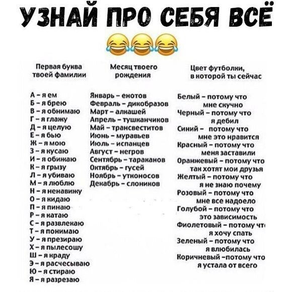 "Я развлекаю алкашей, потому что меня заставили") - так получилось когда я применил всё на себя... Неправильный тест, - решил я и вспомнил, что недавно переодел футболку черного цвета и получилось еще хуже - "я развлекаю алкашей, потому что я де**л". Ерундистика полная и решил перейти к другому тесту: "Сонный ковбой под куполом цирка". Уже получше, но тоже как-то не айс. Какой из меня ковбой, если я не знаю даже с какой стороны подойти к лошади и, тем более, сонный? И под купол цирка не загнать никакими коврижками, ибо боюсь высоты вообще, а цирк не люблю в частности. Один раз в жизни был в цирке Чинизелли на Фонтанке и больше туда ни ногой. Так что тоже неправильный тест, не про меня... Посмотрим что там с девизом: "Есть смысл смотреть по*но и улыбаться" - уже лучше, но тоже особого восторга не вызывает. Если бы у меня первая буква имени и фамилии была другая, то вполне бы ко дню рождения, то есть цифры, то вполне приемлемый вариант получился бы... И даже несколько вариантов подобр