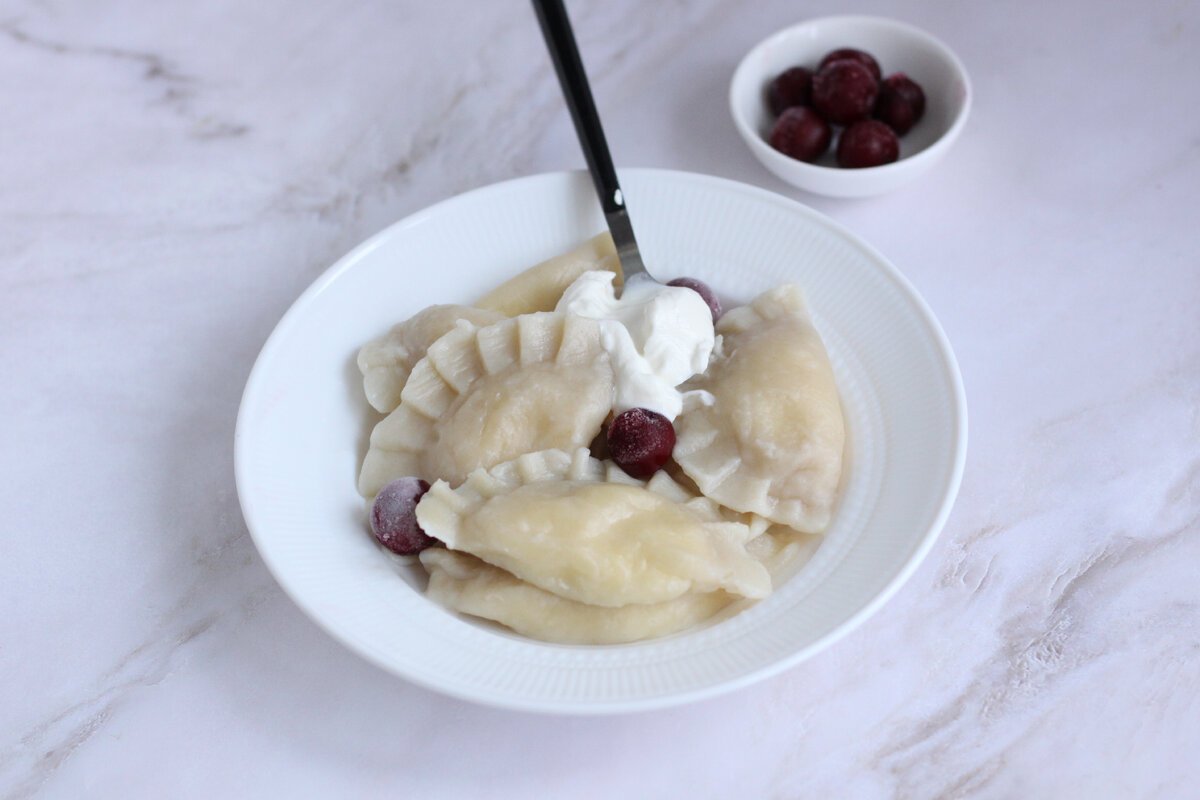 Откровенно говоря, лепка пельменей, вареников и проч., явно, не самая моя сильная сторона. Поэтому я без раздумий заказала новый девайс и сразу же решила его использовать в деле. Ниже я напишу рецепт, а в конце поделюсь своим мнением насчет этой "штучки". Идеальное тесто, конечно, это мое субъективное мнение, но испробовав несколько рецептов, я остановила свой выбор в пользу именно этого рецепта. В миску положить сливочное масло и соль, залить кипятком и размешать до полного растворения. В горячую смесь частями ввести просеянную муку и замесить мягкое и эластичное тесто. Готовое тесто завернуть в пленку и оставить на 30 минут. Творог смешать с сахаром. Тесто раскатать, стаканом вырезать круги. В "варениколепке" одна сторона как раз предназначена для вырезания ровных кругов. В центр круга выложить часть творожной начинки и защипить края. Варить вареники в подсоленной воде. Я варила не все. Часть заморозила. Ингредиенты: 340 г муки (может немного больше)