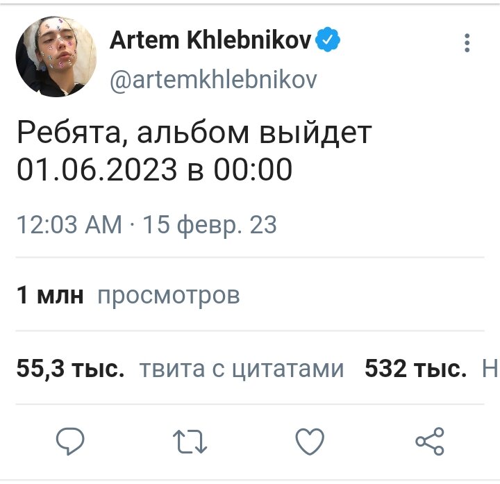 Артем Хлебников озвучил дату выхода своего первого альбома. Ранее певец выпускал хиты, но не разу не говорил, что планирует выпускать альбом Певец опубликовал пост в Твиттере, где сообщил, что его первый сольный альбом выйдет 1 июня.